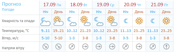 Сайт Укргидрометцентра обещает солнечную погоду до пятницы включительно. Днем +21...+23, со среды до +25. Ночью +9...+13.