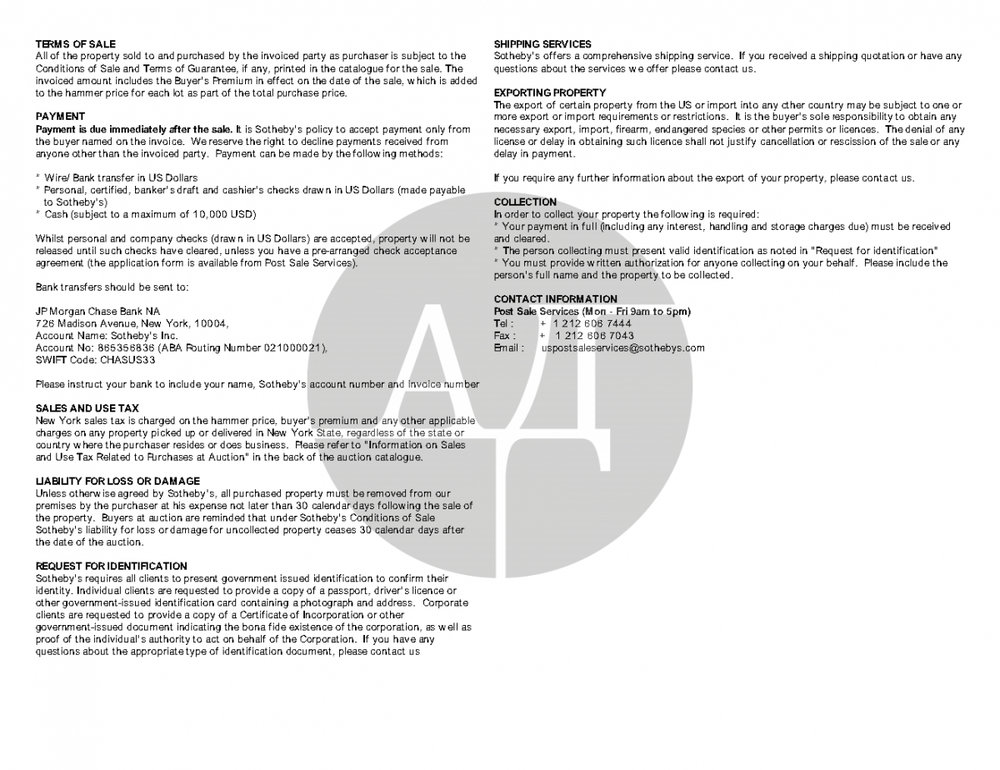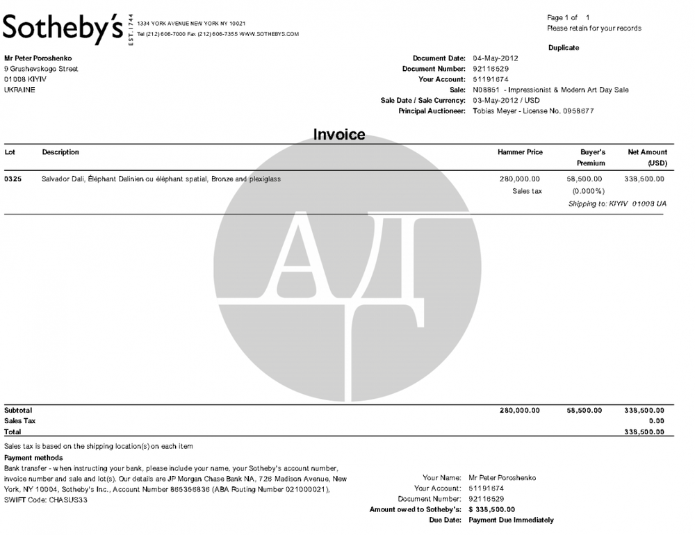 Счет (инвойс) от Sotheby's был выставлен непосредственно на имя Порошенко - 4 мая 2012 года, в котором указано, что доставка осуществляется в г. Киев, индекс 01008 на улицу Грушевского, 9. То есть, в личную квартиру Порошенко возле ВР.