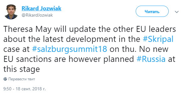 Премьер-министр Великобритании Тереза ​​Мэй сообщит другим лидерам ЕС о последних результатах расследования в деле отравления экс-сотрудника ГРУ РФ Сергея Скрипаля на неформальном саммите в Зальцбурге в четверг, 20 сентября. Об этом сообщил брюссельский корреспондент "Радио Свобода" Рикард Йозвяк на своей странице в Twitter.