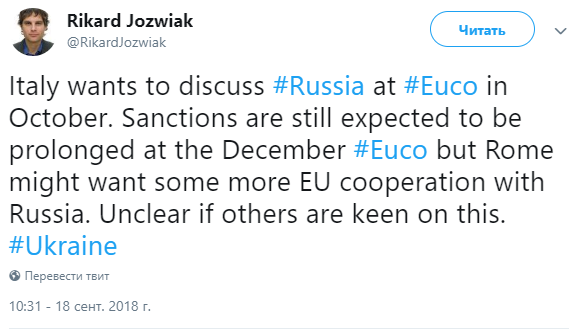 Италия планирует поднять вопрос смягчения антироссийских санкций на заседании Европейского совета в октябре. Об этом во вторник, 18 сентября, сообщил корреспондент Радио Свобода Рикард Йозвяк на своей странице в Twitter.