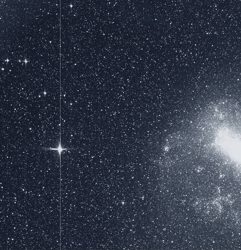 Выше Малого Магелланова Облака заметно большое шаровое звездное скопление 47 Tукана, а самые яркие звезды на картинке это Бета Журавля и R Золотой Рыбы, сигналы от которых создают эффект Блуминга (размывание) на кадрах.