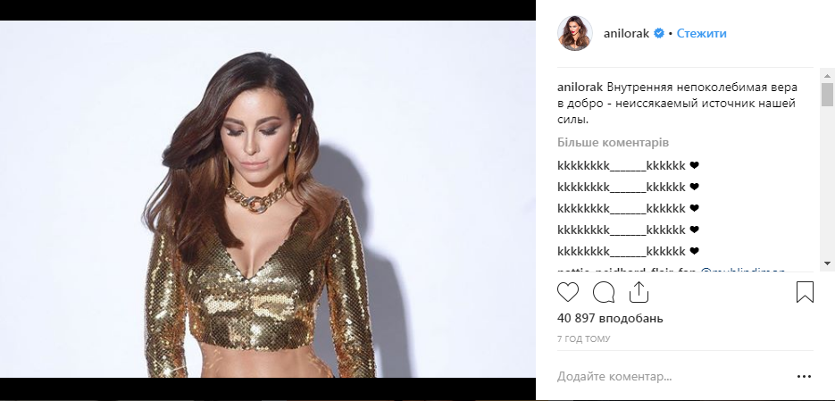 На певице - топ, расшитый золотистыми пайетками, а также массивная золотая цепь. Кроме того, Лорак на снимке с довольно ярким вечерним макияжем и стильной укладкой.