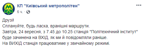В связи с этим в "Киевский метрополитен" призвали пассажиров, которые едут утром с "Политехнического института", переориентировать свои маршруты на станции "Шулявская", "Лукьяновская" или "Вокзальная".