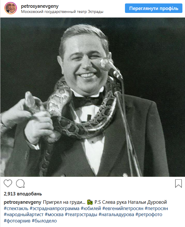 Петросян разместил архивную черно-белую фотографию, на которой вокруг его шеи обвивается удав. Также уточняется, что владельцем рептилии является российская дрессировщица Наталья Дурова.
