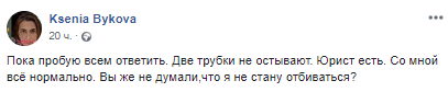 "Юрист есть. Со мной всё нормально. Вы же не думали, что я не стану отбиваться?" - написала Быкова.