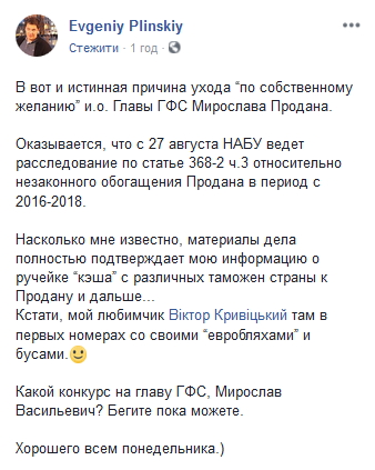 "Вот и истинная причина ухода "по собственному желанию" и.о. главы ГФС Мирослава Продана. Оказывается, что с 27 августа НАБУ ведет расследование по статье 368-2 ч.3 относительно незаконного обогащения Продана в период с 2016 по 2018 год.