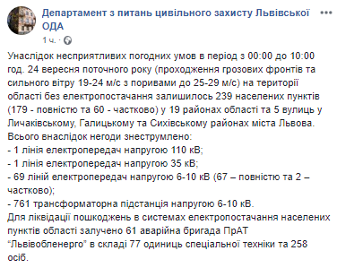 "На территории области без электроснабжения осталось 239 населенных пунктов (179 - полностью и 60 - частично) в 19 районах области и пять улиц в Лычаковском, Галицком и Сиховском районах города Львова", - говорится в сообщении.