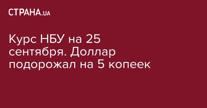 Во вторник, 25 сентября, Нацбанк Украины (НБУ) установил официальный курс доллара на уровне 28,11 грн/долл. По сравнению с предыдущим банковским днем, доллар подорожал на 5 копеек. Об этом сообщается на сайте регулятора.