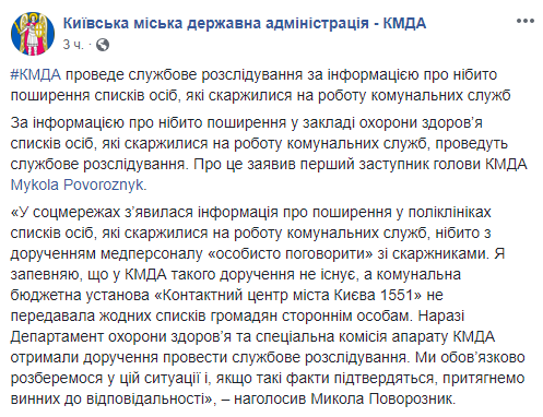 "Я уверяю, что в КГГА такого поручения не существует, а коммунальная бюджетное учреждение" Контактный центр города Киева 1551 не передавало никаких списков граждан посторонним лицам", - цитирует пресс-служба КГГА первого заместителя главы администрации Николая Поворозника.