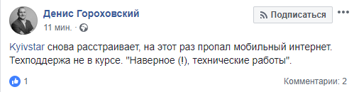 Об отсутствии мобильного интернета Киевстар сообщают жители Киева, Сум и Днепра. Они оставляют комментарии на странице мобильного оператора в Facebook.
