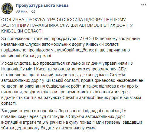 По словам Максимец, подозрение в совершении преступления 27 сентября уже объявлено первому заместителю начальника Службы автомобильных дорог в Киевской области. Его подозревают в служебной халатности, повлекшей миллионные убытки государству.