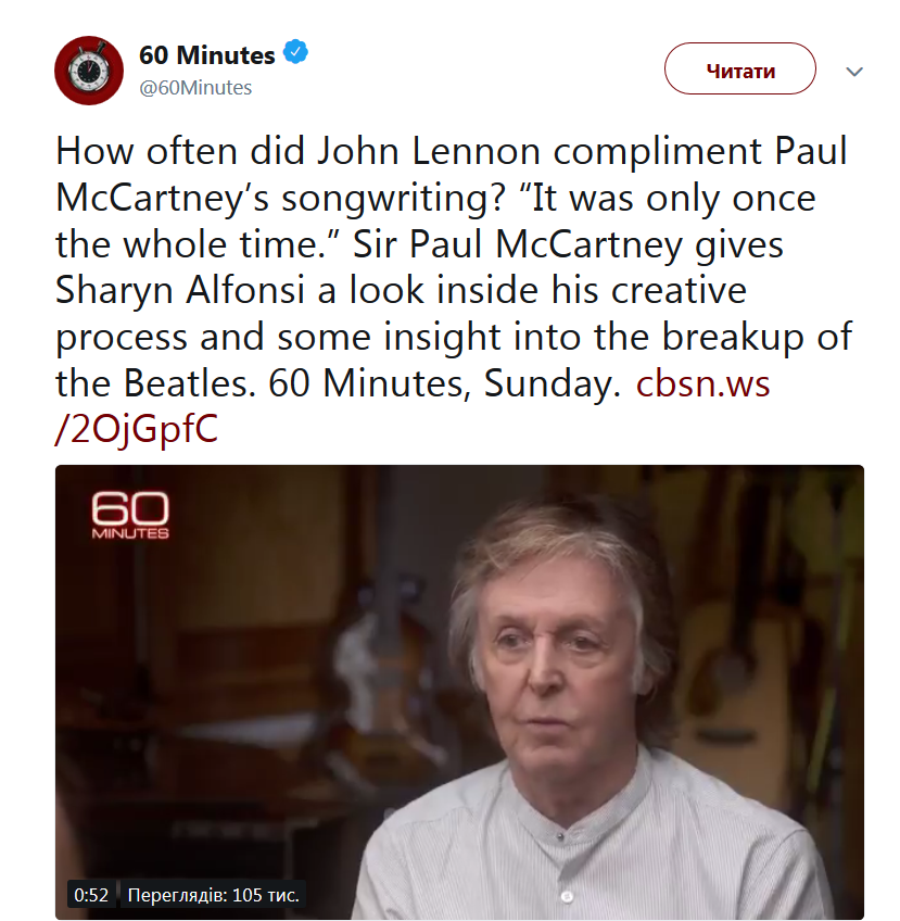 Об этом Маккартни заявил в эфире телепередачи "60 minutes".