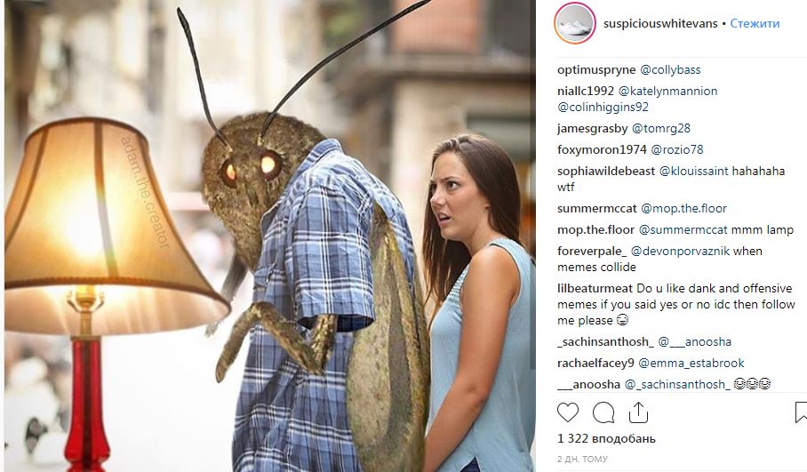 Однако настоящую популярность мем приобрел лишь в конце сентября. Чаще всего создатели смешных картинок использовали изображение огромного мотылька, которое ранее публиковали пользователи Reddit. Насекомое даже сделали участником второго популярного мема про неверного парня и даже представителе мотылька в качестве инспектора ламп.