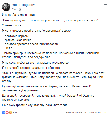 Также блогер полагает, что подобные заявления должны сопровождаться общественным порицанием. А люди, которые позволили себе подобные высказывания, как минимум, должны публично извиняться.