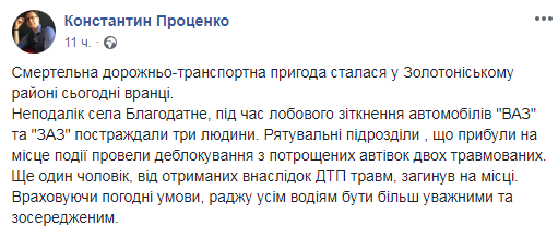 Неподалеку от села Благодатное в Черкасской области произошло серьезное ДТП. "Лоб в лоб" врезались автомобили "ВАЗ" и "ЗАЗ". Об этом сообщил помощник начальника областного ГУ ГСЧС Константин Проценко на странице в Facebook.