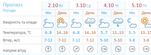 По данным сайта Sinoptik.ua, дождь будет идти во вторник, среду и четверг. 1 и 2 октября днем +15...+17. Со среды дневная температура +11...+14. На выходных солнечно, без осадков, +16...+18. Ночью +3...+7.