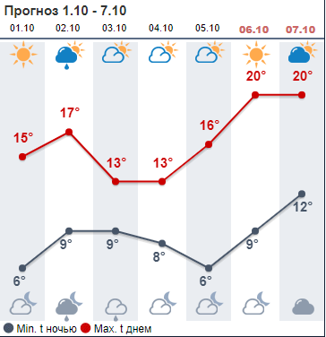 Сайт Укргидрометцентра обещает слабый дождь в среду и четверг. В начале недели днем +14...+16, со среды немного похолодает до +11...+15. Ночью +3...+8.