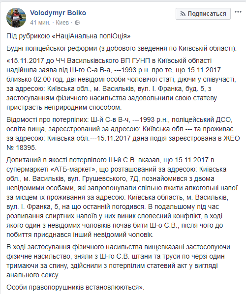 Эта история восходит к событиям, развернувшимся 15 ноября 2017 года в доме на улице Ивана Франко (ранее - переулок Коммунальный) города Василькова Киевской области. В дежурную часть управления полиции обратился полицейский Печерского райотдела Государственной службы охраны Станислав Шумский с заявлением об изнасиловании его двумя мужчинами.