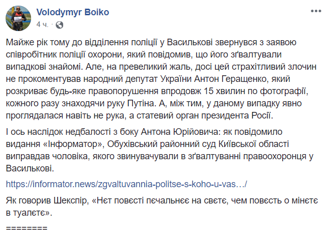 Согласно им, в начале лета обвиняемые в изнасиловании полицейского АТОшники были признаны невиновными по основной части претензий - в насильственном удовлетворении половой страсти неестественным способом. Издание Informator.news со ссылкой на источник пишет, что основанием для оправдания одного из мужчин якобы стал тот факт, что заявитель-коп оказался гомосексуалистом и половой акт между ним и обвиняемым совершался по взаимному согласию. На это сообщение уже отреагировал вышеупомянутый журналист Бойко: