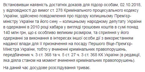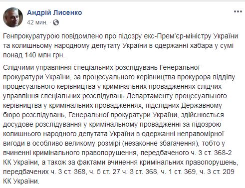 Генпрокуратурой сообщено о подозрении экс-премьер-министру Украины и бывшему народному депутату Украины в получении взятки в сумме более 140 млн грн. Об этом сообщил спикер ГПУ Андрей Лысенко в Facebook.