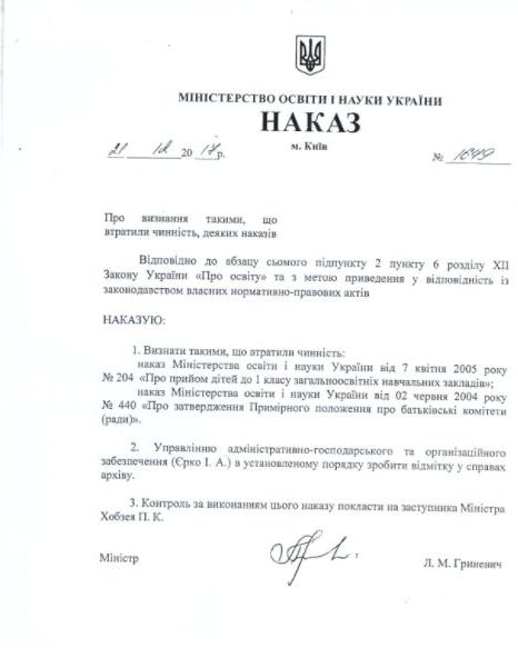 Из той же оперы - попытка запретить родительские комитеты в украинских школах. В этом году министерство образования издало такой приказ. Очередной документ, не имеющий ничего общего с реальностью, был опубликован 1 февраля 2018 года. Его итоги известны - родкомитеты, существовавшие де-юре, остались в полном составе работать де-факто.