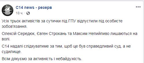 Киевский суд отпустил под личное обязательство всех трех активистов С14 из-за столкновения под ГПУ, во время которого избили журналистку NewsOne Дарину Билеру. Об этом радикалы написали в Facebook.