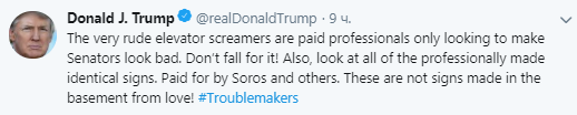 Участников митингов президент США назвал проплаченными профессионалами, которые хотят выставить сенаторов в плохом свете. И что протесты проплачены "Соросом и другими".