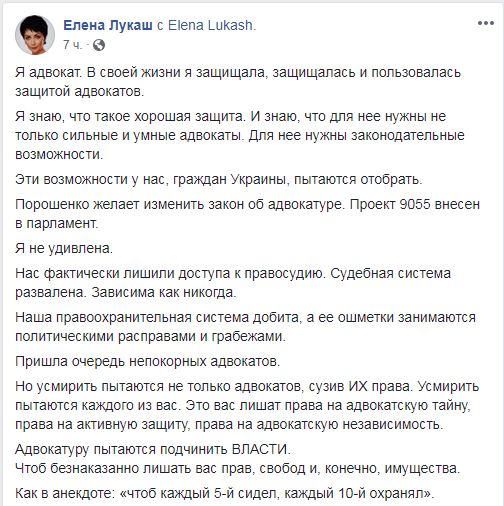 Известный адвокат Елена Лукаш считает, что законопроектом №9055 украинцев лишают доступа к правосудию, а адвокатов подчинить власти. "Судебная система развалена. Наша правоохранительная система добита, а ее ошметки занимаются политическими расправами и грабежами. Пришла очередь непокорных адвокатов. Но усмирить пытаются не только адвокатов, сузив ИХ права. Усмирить пытаются каждого из вас. Это вас лишат права на адвокатскую тайну, права на активную защиту, права на адвокатскую независимость", - пишет Лукаш.