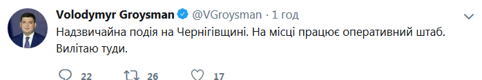 "Чрезвычайное происшествие на Черниговщине. На месте работает оперативный штаб. Вылетаю туда", - сообщил он в микроблоге Twitter.