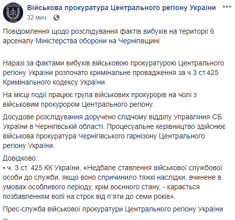 По фактам взрывов начато уголовное производство по ч.3 ст.425 Уголовного кодекса Украины "Небрежное отношение военного должностного лица к службе, повлекшее тяжкие последствия, совершенное в условиях особого периода, кроме военного положения". Наказывается лишением свободы на срок от 5 до 7 лет.