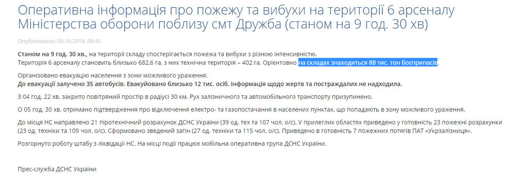 В свою очередь, на сайте Управления ГСЧС в Черниговской области по состоянию на 11:15 есть сообщение о том, что на складах 6-го арсенала под Ичней находится около 88 000 тонн боеприпасов.