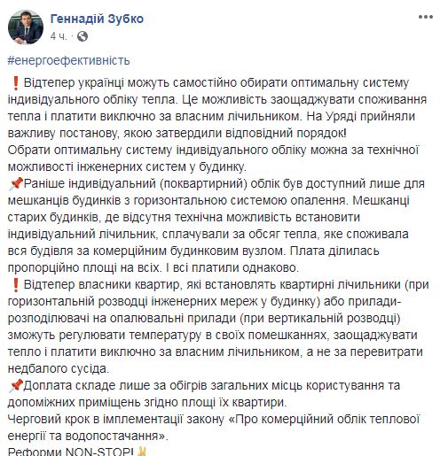 "Отныне украинцы могут самостоятельно выбирать оптимальную систему индивидуального учета тепла. Это возможность экономить потребление тепла и платить исключительно по собственному счетчику. На заседании правительства приняли важное постановление, которым утвердили соответствующий порядок", - прокомментировал Зубко.