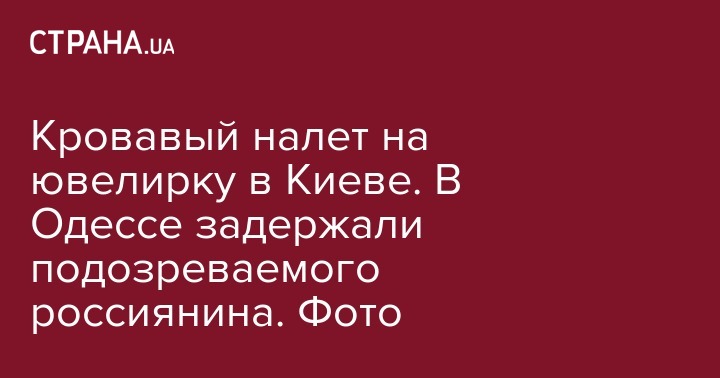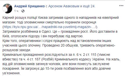 "Уголовный розыск полиции Киева задержал одного из нападавших на ювелирный магазин: тогда злоумышленники смертельно ранили охранника. Задержали разбойника в Одессе. Это - гражданин России", - сообщил он. Задержанного доставили в Киев и объявили подозрение, на данный момент он находится под стражей.