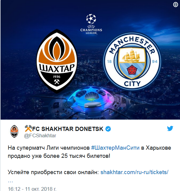 Через две недели, 23 октября, Шахтер в Харькове встретится с английским Манчестер Сити, в матче третьего тура Лиги чемпионов. На стадионе будет аншлаг. На этом момент проданоо уже 25 000 билетов, при том что ОСК "Металлист" вмещает 40 003 зрителя.