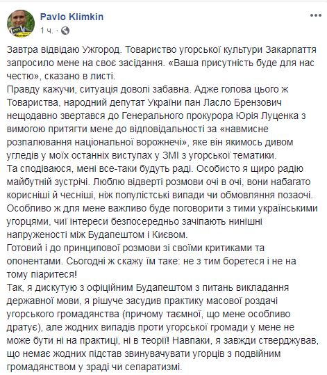 "Завтра посещу Ужгород. "Общество венгерской культуры Закарпатья" пригласило меня на свое заседание. "Ваше присутствие будет для нас честью", говорится в письме", - сообщил он. Он отметил, что "ситуация забавная", так как председатель этого общества, народный депутат Украины Ласло Брензович недавно обращался к генеральному прокурору Юрию Луценко с требованием привлечь главу МИД к ответственности за "умышленное разжигание национальной вражды". "Надеюсь, мне все-таки будут рады. Лично я искренне радуюсь предстоящей встрече. Люблю откровенные разговоры глаза в глаза, они намного полезнее и честнее, чем популистские выпады или очернение за спиной", - сказал Климкин.