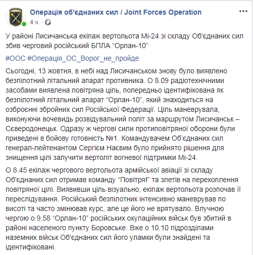 Инцидент произошел около 08:00. Военнослужащим удалось выяснить, что это беспилотник "Орлан-10", который находится на вооружении вооруженных сил РФ. При помощи дрона противник пытался осуществить разведку территории, которая находится между Лисичанском и Северодонецком.