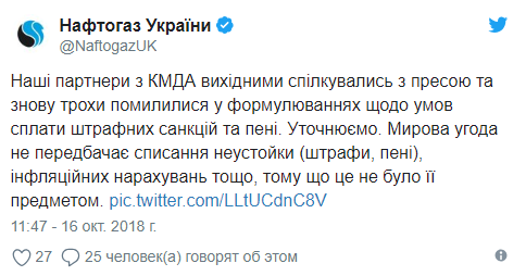 "Наши партнеры из КГГА на выходных общались с прессой и снова немного ошиблись в формулировках об условиях уплаты штрафных санкций и пени. Уточняем. Мировое соглашение не предусматривает списание неустойки (штрафы, пени), инфляционных начислений и т.д., потому что это не было ее предметом" , - говорится в сообщении.