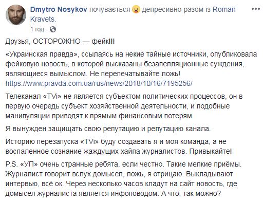P.S. УП очень странные ребята, если честно. Такие мелкие приёмы. Журналист говорит вслух домысел, ложь, я отрицаю. Выкладывают интервью, всё ок. Через несколько часов кладут на сайт новость, где домысел журналиста является инфоповодом. А что, так можно?" - написал Носиков.