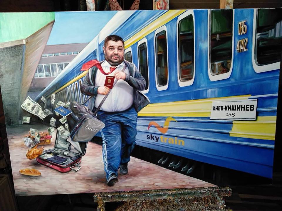 Отметим, что на картине изображен человек, похожий на нардепа от Блока Петра Порошенко Александра Грановского (считается смотрящим от БПП за судами), бегущий за уходящим поездом в Кишинев (где находится сейчас близкий к нему судья Чаус) с иностранным паспортом в руках. "Это антиолигархическое полотно, типа прививка от коррупции", - отметила Светлана Крюкова в комментариях к посту.