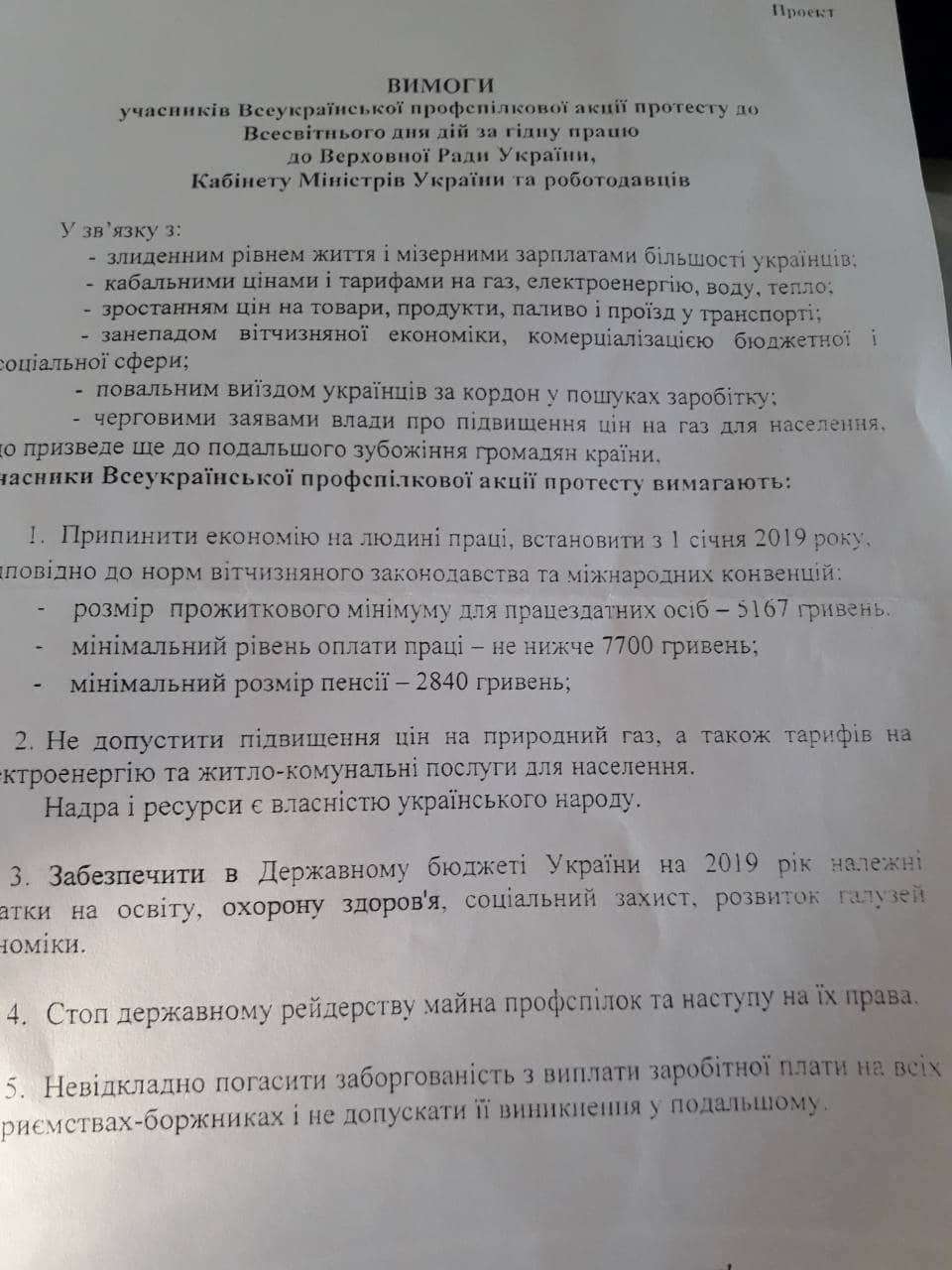 Среди основных требований профсоюзов - поднятие прожиточного минимума для работоспособных лиц до 5167 грн, минимальной зарплаты - до 7700 грн, минимальной пенсии - до 2840 грн. Кроме того, они требуют остановить подорожание газа, а также погасить все долги по зарплатам и обеспечить финансирование жизненно важных сфер на следующий год.