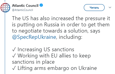 Также во время выступления спецпредставитель США заявил, что администрация президента Трампа продолжит усиливать давление на Россию, в первую очередь путем введения новых санкций с периодичностью месяц или два.