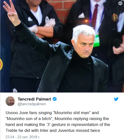 Однако португальский специалист очень достойно потроллил итальянцев в ответ. Он показал болельщикам Ювентуса три пальца. Этот жест символизировал требл, который Моуринью завоевал с миланским Интером, одним из злейших противников туринской команды.