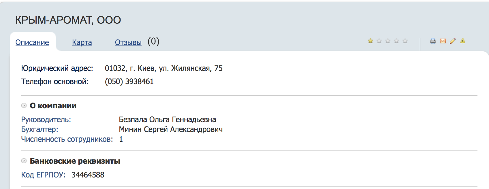 Так, в Украине существует свое предприятие "Крым-аромат". По странному совпадению в базах данных ее адрес находится в том же помещении, что и офис Адамовского - Жилянская 75, бизнес-центр "Евразия".