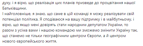 "Обдумывая свое будущее, я пришла к выводу, что как политик я получу больше возможностей помогать нашим бойцам, временно перемещенным лицам и всем нуждающимся. И свою помощь я вижу в восстановлении социальной справедливости для каждого нуждающегося гражданина Украины", – написала певица.
