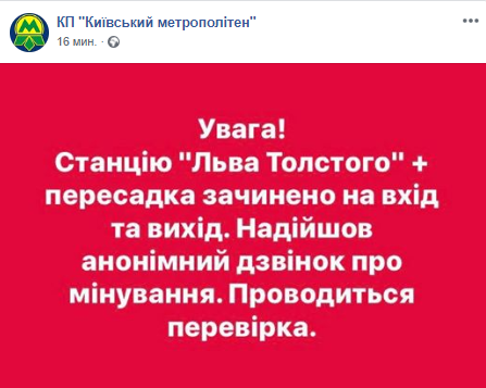 В Киеве закрыта на вход и выход станция метро "Льва Толстого". Это произошло после поступления сообщения о заминировании. Об этом сообщает пресс-служба столичной подземки на своей странице в Facebook.
