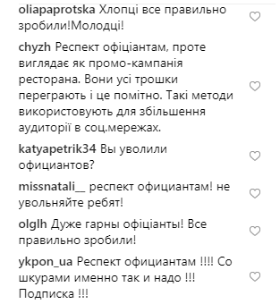 А большая часть выразила мнение, что это похоже на постановку с целью прорекламировать ресторан, который автор видео отметил активной ссылкой под постом. При этом некоторые сомневающиеся в правдивости видео написали, что даже, если это такой пиар-ход, то очень странный и что его авторы явно "не дочитали книжек".