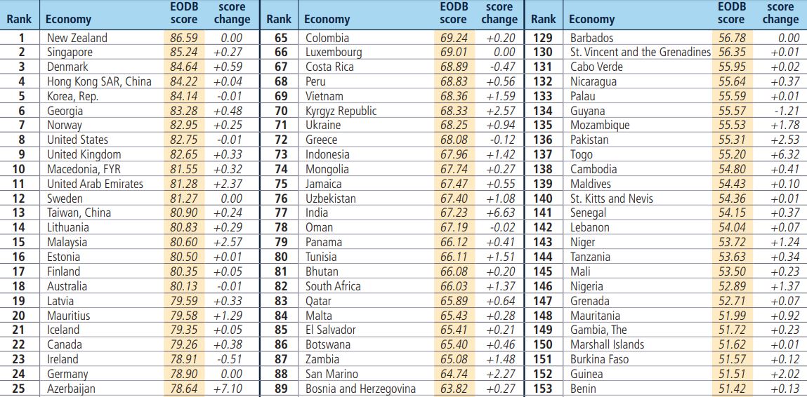 Новый мировой рейтинг легкости ведения бизнеса Doing Business-2019 от Всемирного банка, в котором Украина поднялась с 76 на 71 позицию, возглавила Новая Зеландия. Об этом говорится на сайте рейтинга.