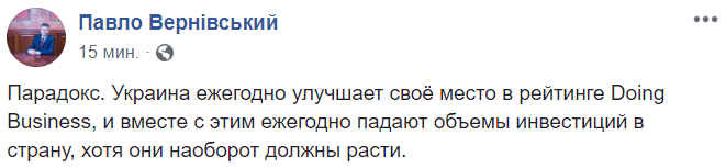 "Парадокс. Украина ежегодно улучшает своё место в рейтинге Doing Business, и вместе с этим ежегодно падают объемы инвестиций в страну, хотя они наоборот должны расти", - пишет экономический обозреватель Павел Вернивский.