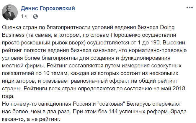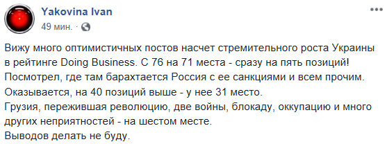 "Вижу много оптимистичных постов насчет стремительного роста Украины в рейтинге Doing Business. С 76 на 71 места - сразу на пять позиций!