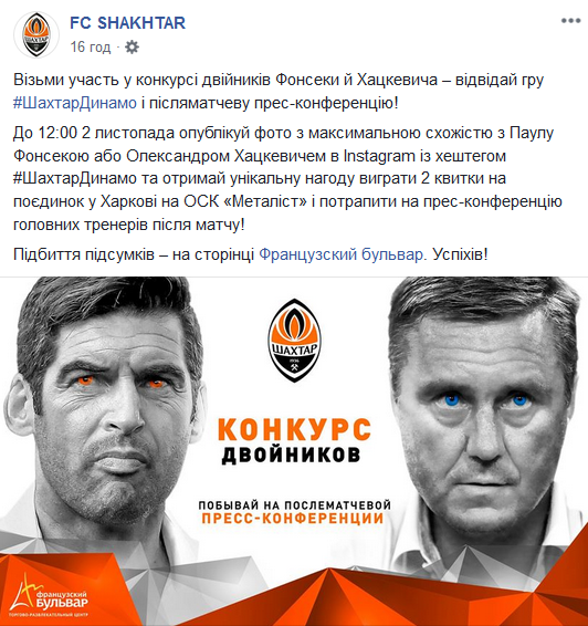 "До 12:00 2 ноября опубликуй фото с максимальным сходством с Паулу Фонсекой или Александром Хацкевичем в Instagram с хештегом #ШахтерДинамо и получи уникальную возможность выиграть 2 билета на поединок в Харькове на ОСК "Металлист" и попасть на пресс-конференцию главных тренеров после матча!", - рассказали в пресс-службе Шахтера.